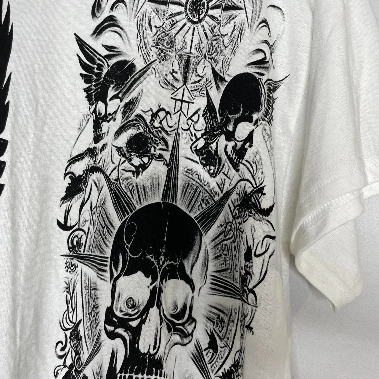 Channel early 2000s streetwear vibes with this custom hand screen-printed white tee, featuring bold skull panel designs on both front and back — a standout piece for lovers of edgy, retro fashion.