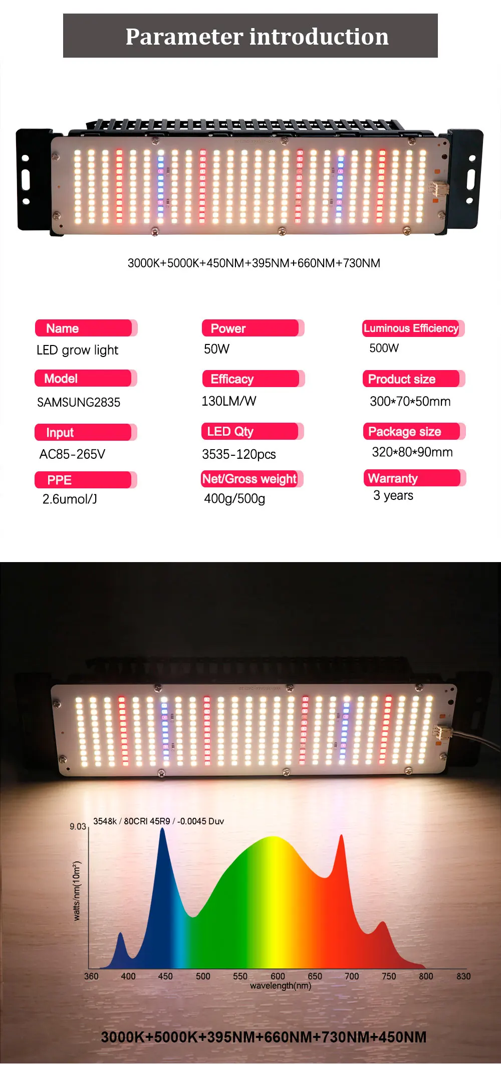 50W full-spectrum LED light simulates natural sunlight for improved photosynthesis