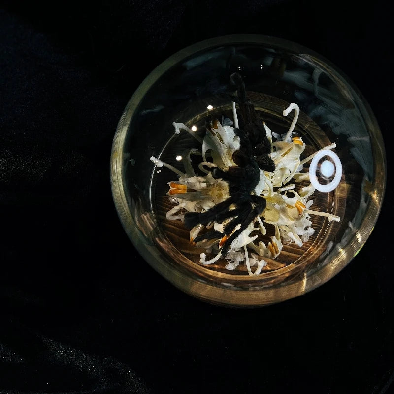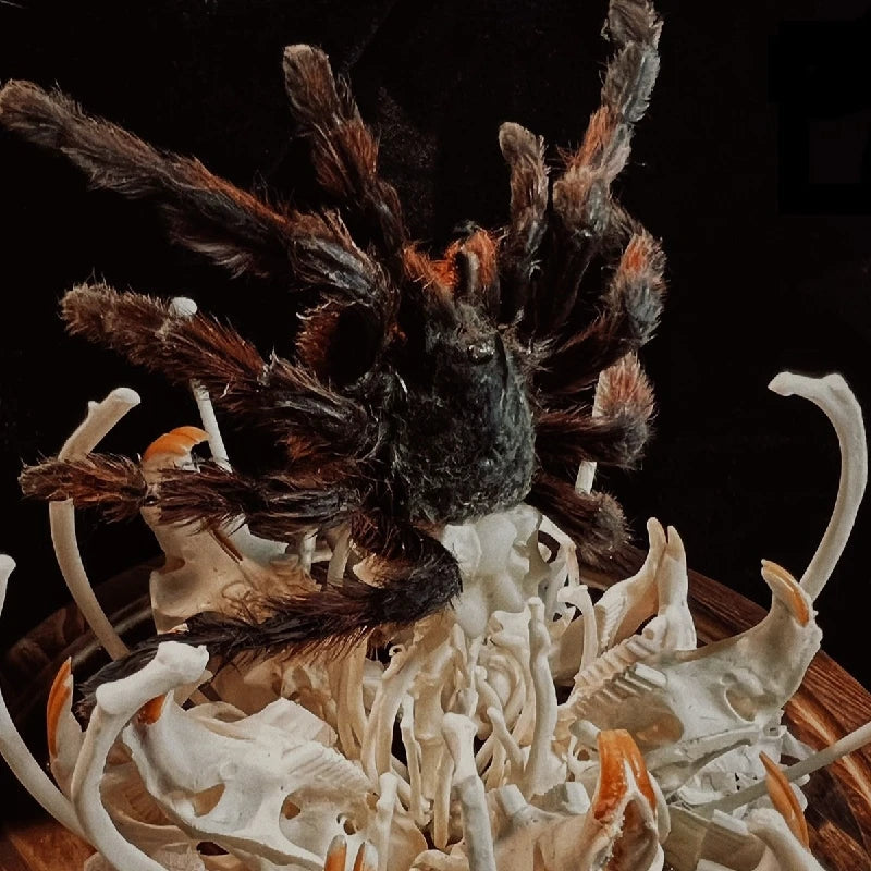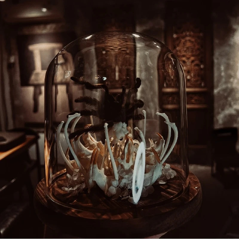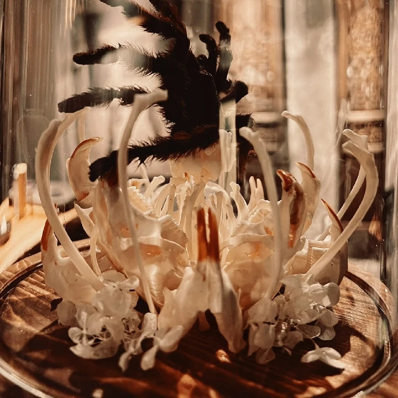 A striking fusion of nature and the macabre, this handmade 3D glass dome features skeletal bones, an insectivorous flower, and a spider in haunting detail — a perfect centerpiece for gothic décor or Halloween displays.