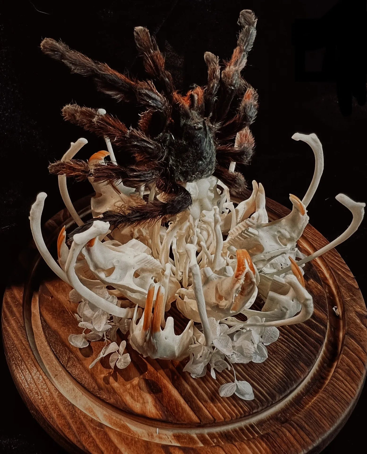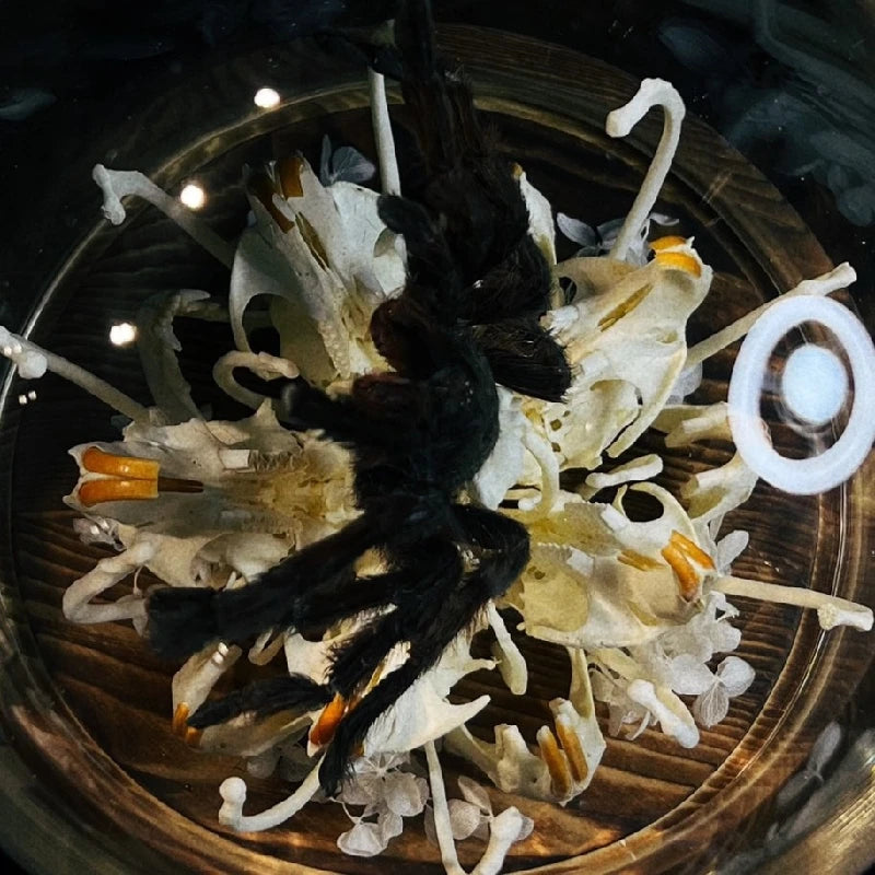 • Intricately arranged 3D composition of bones, spider, and carnivorous flower